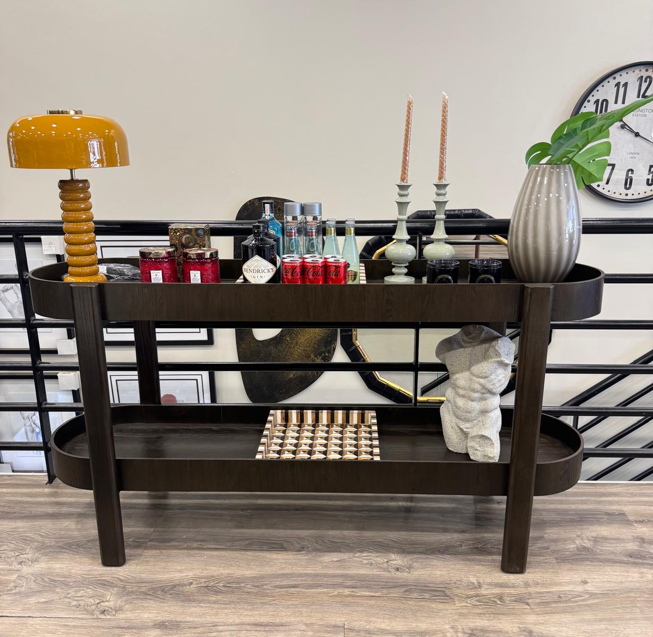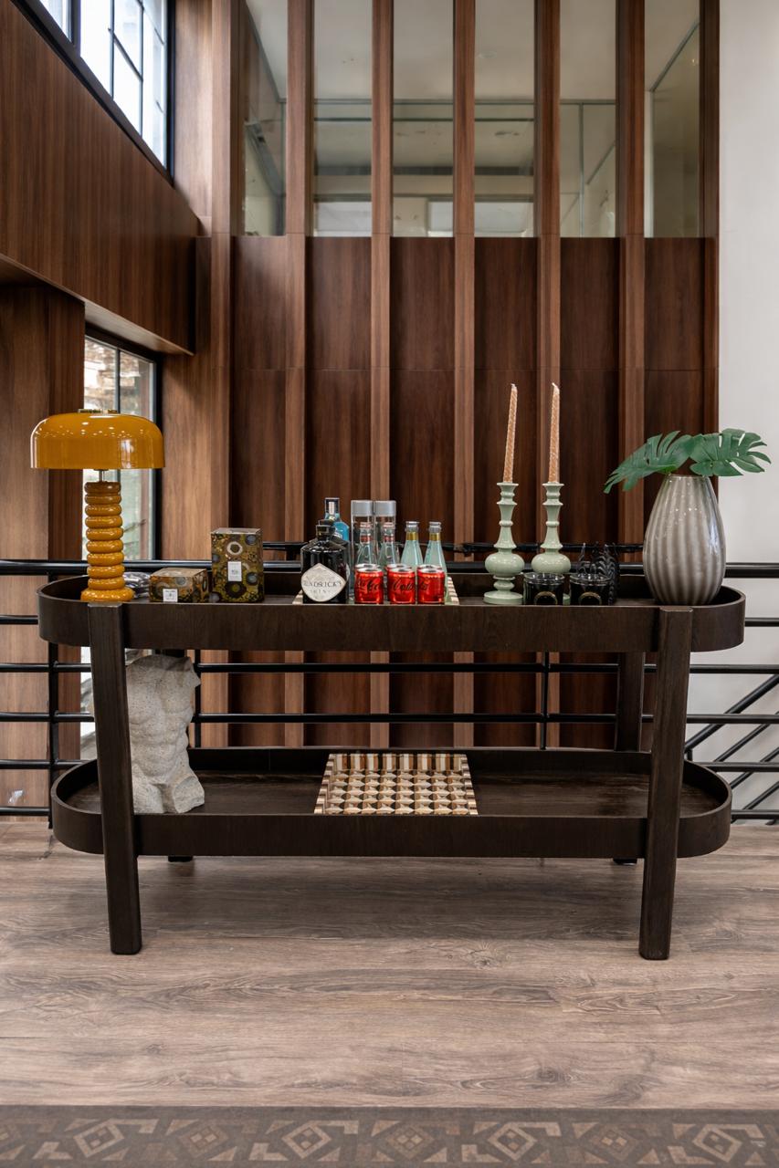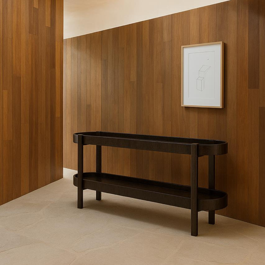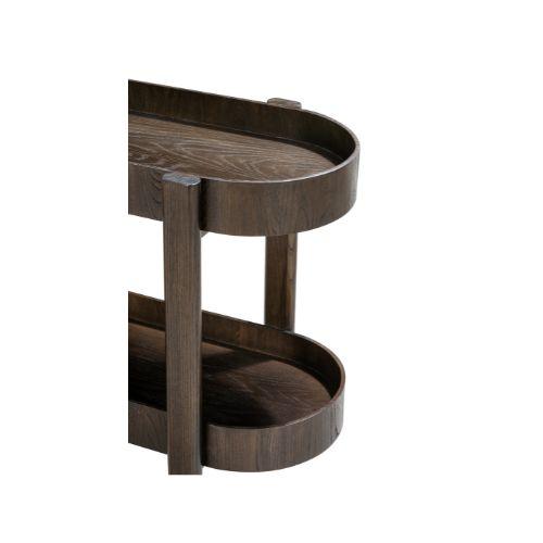 El Arrimo Amalia presenta una repisa de doble nivel con una elegante silueta elíptica, ofreciendo amplio espacio de almacenamiento mientras mantiene un perfil estilizado y armonioso. Está elaborado enchapado en roble, donde la veta natural se convierte en una verdadera obra de arte. Cada una de sus cuatro patas es cuidadosamente redondeada por artesanos, añadiendo un toque encantador a su elegancia clásica.