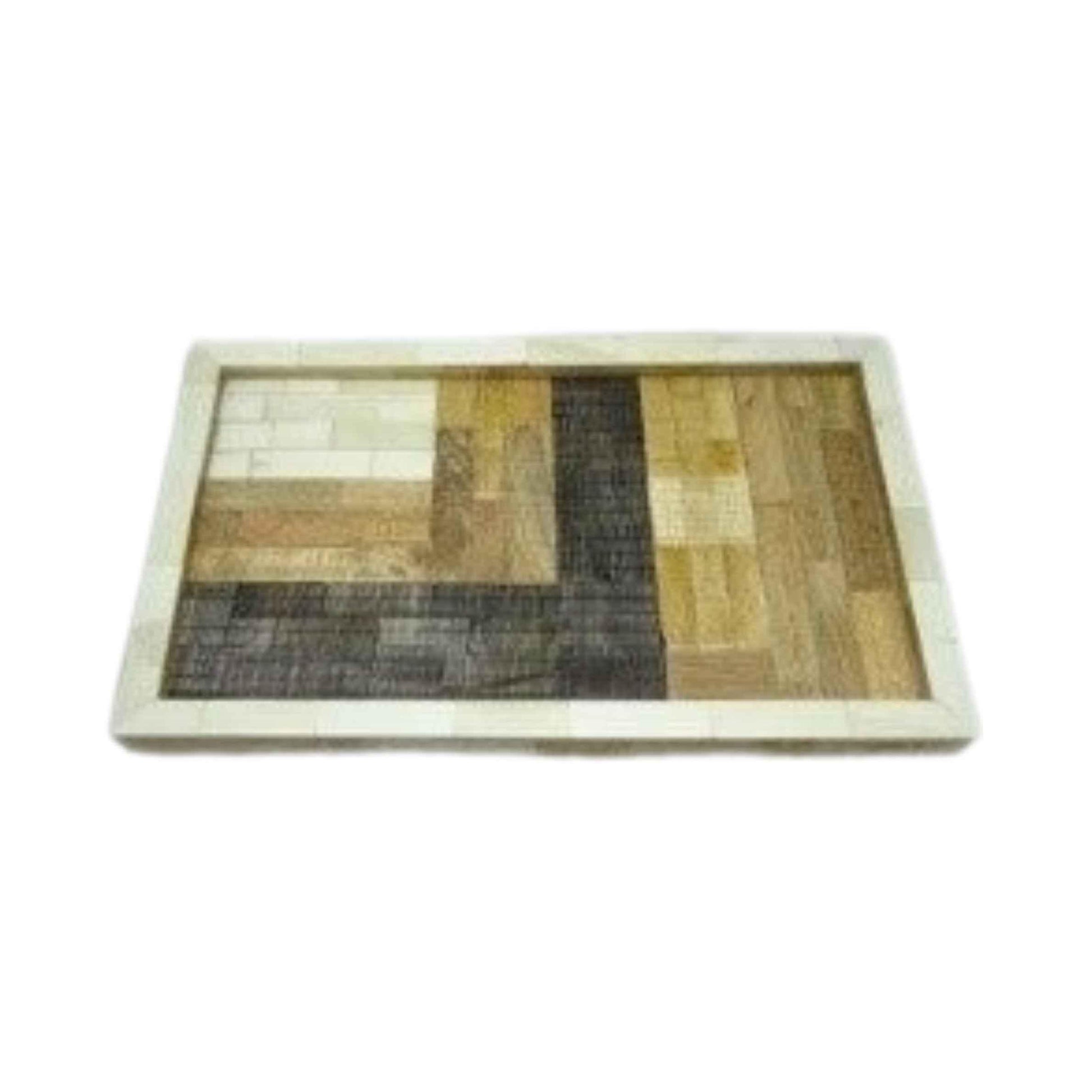 Esta elegante bandeja decorativa combina funcionalidad y estilo con un diseño geométrico de mosaico en tonos madera natural, blanco y negro. Su marco robusto y acabado artesanal la convierten en una pieza ideal para servir bebidas, organizar objetos o como elemento decorativo en mesas y superficies. Perfecta para agregar un toque rústico y moderno a cualquier espacio.