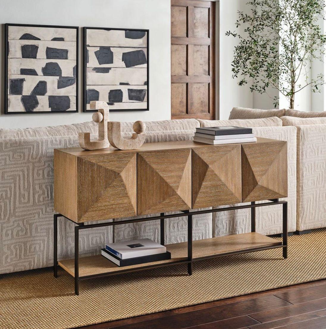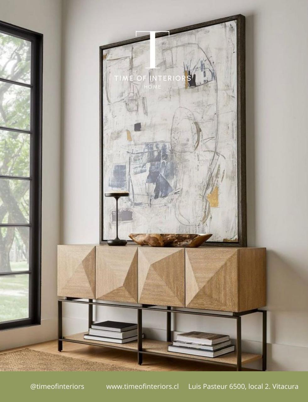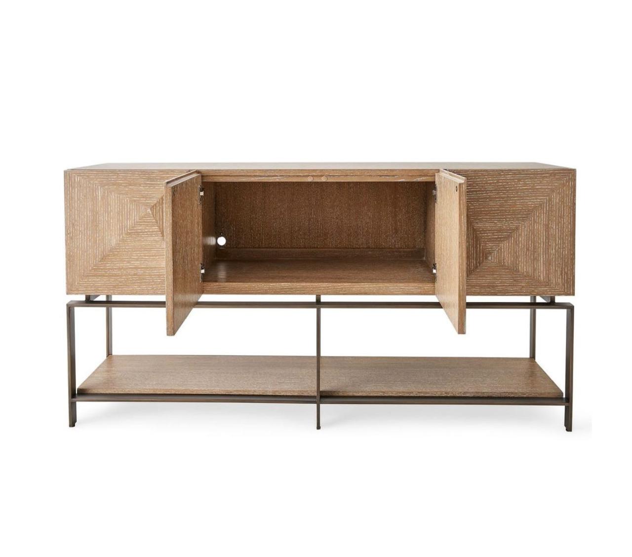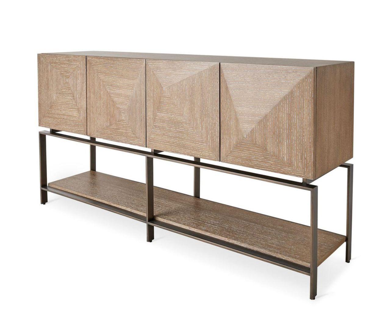 El Buffet León presenta un diseño contemporáneo y carácter arquitectónico, con puertas revestidas en roble y detalles enchapados en esta madera, destacando su geometría y juego de volúmenes. La estructura se apoya sobre un marco metálico inferior que aporta ligereza visual y un contraste sutil entre lo cálido y lo industrial. Una pieza funcional y expresiva, pensada para organizar y vestir un espacio con personalidad y elegancia.
