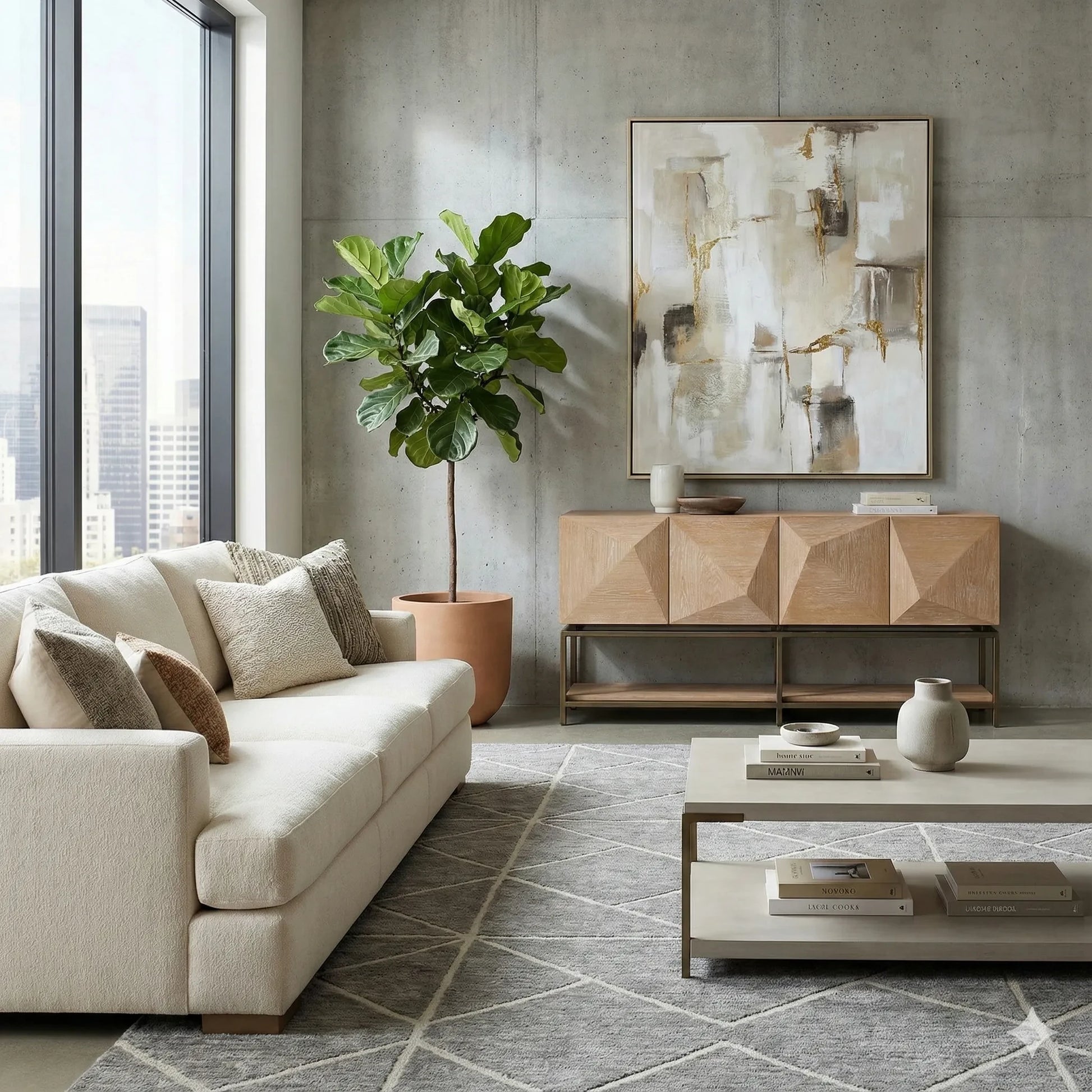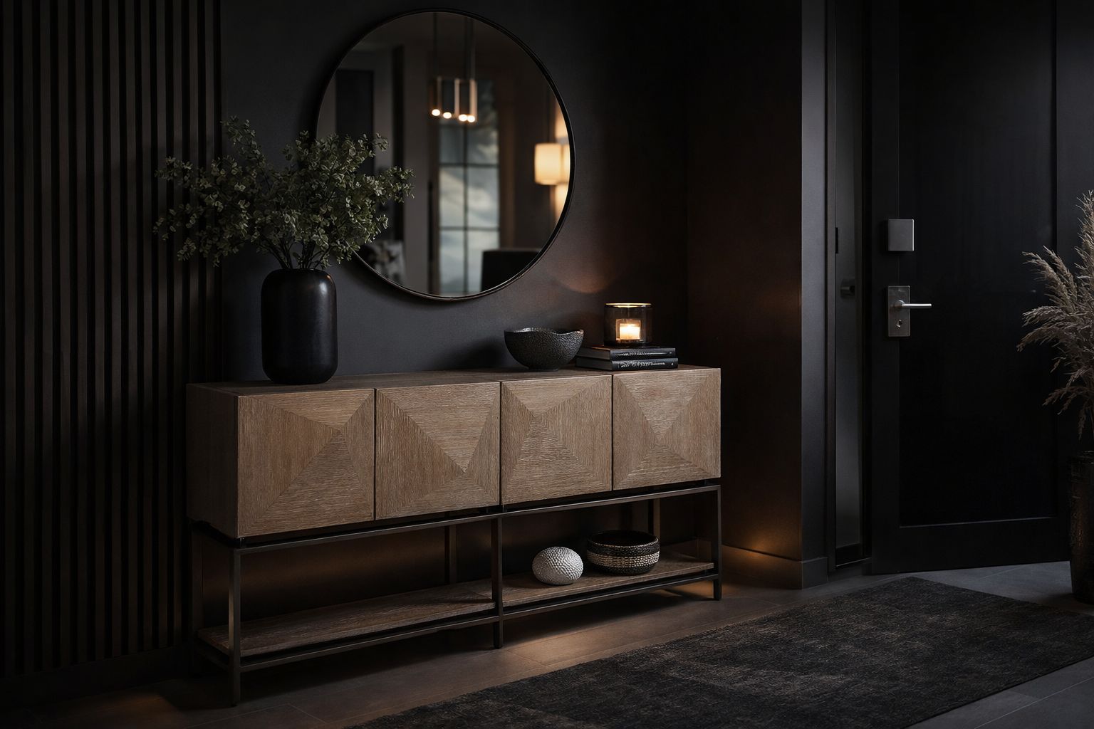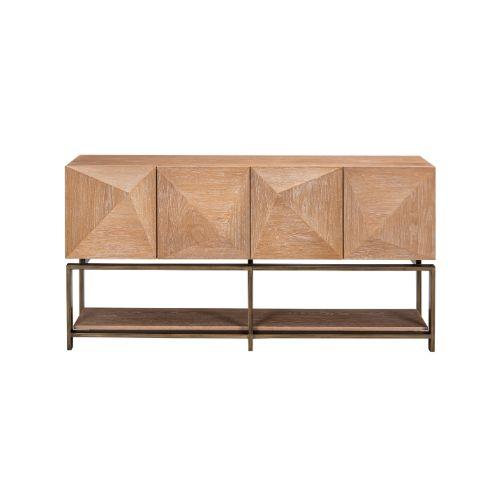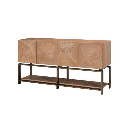 El Buffet León presenta un acabado en roble envejecido que realza su diseño armonioso. Las puertas del mueble incorporan chapas de roble dispuestas en ángulos variados, creando una composicion visual similar a una obra de arte. El marco metálico aporta un toque moderno, mientras que la repisa inferior añade un espacio de almacenamiento práctico, convirtiendo esta pieza en una opción tanto elegante como funcional.