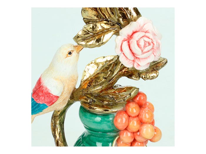 El Candelabro Assunta destaca por su diseño sofisticado y lleno de encanto. Su estructura combina una base verde esmeralda con detalles dorados envejecidos y una delicada figura de ave, creando una pieza que fusiona naturaleza y arte en perfecta armonía.