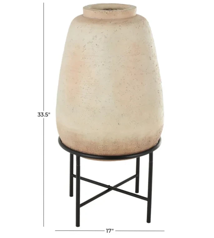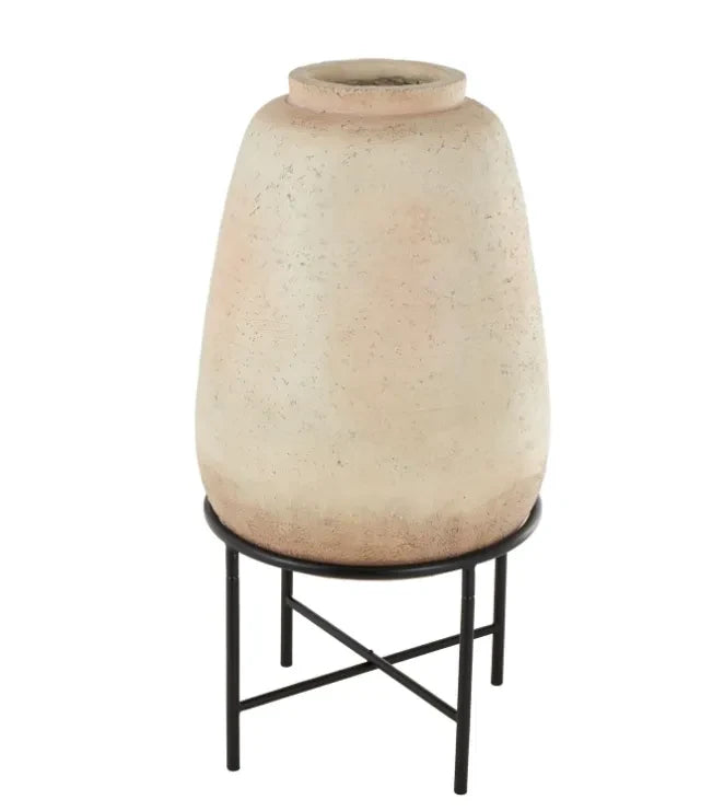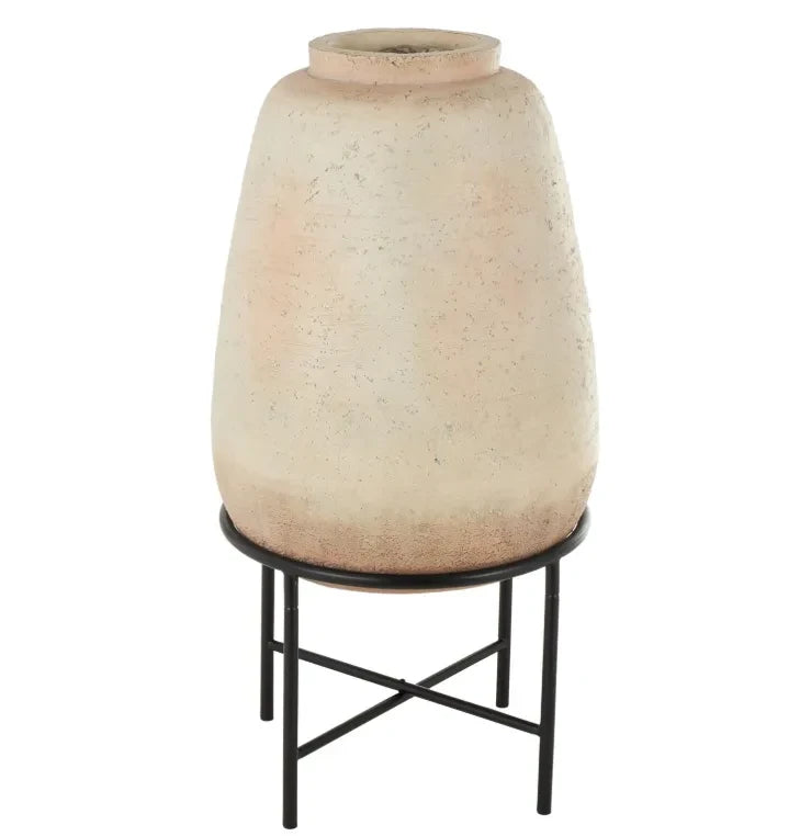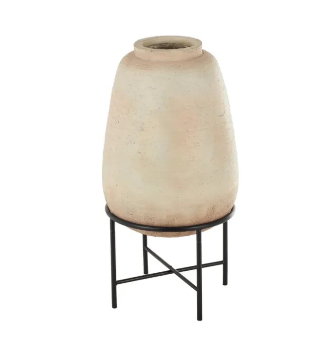 Este jarrón en base es una pieza de gran impacto visual, perfecta para dar protagonismo a un espacio. Su altura y estructura metálica elevan la pieza, convirtiéndola en un elemento escultórico ideal para livings, halls de entrada o espacios amplios.