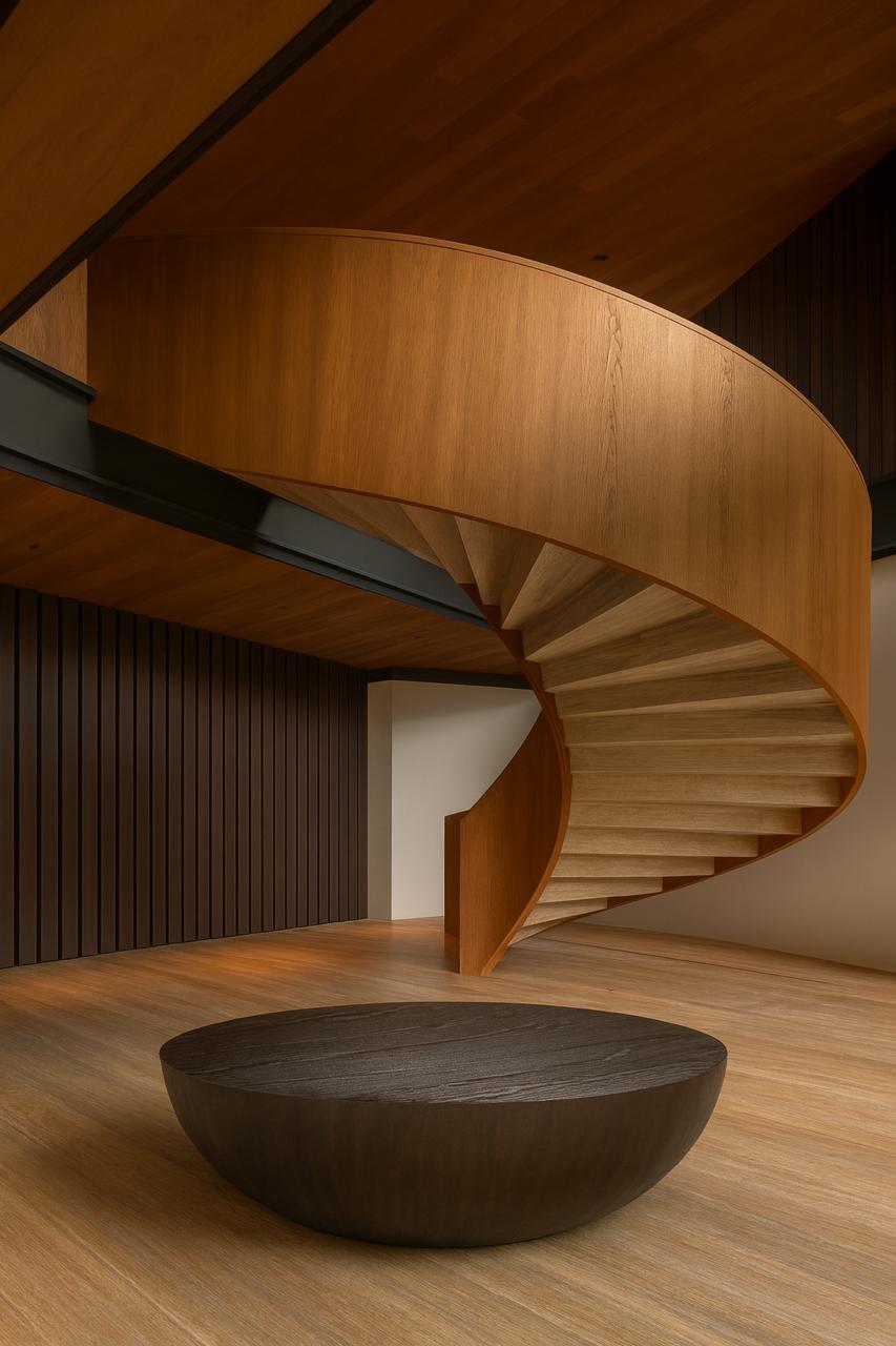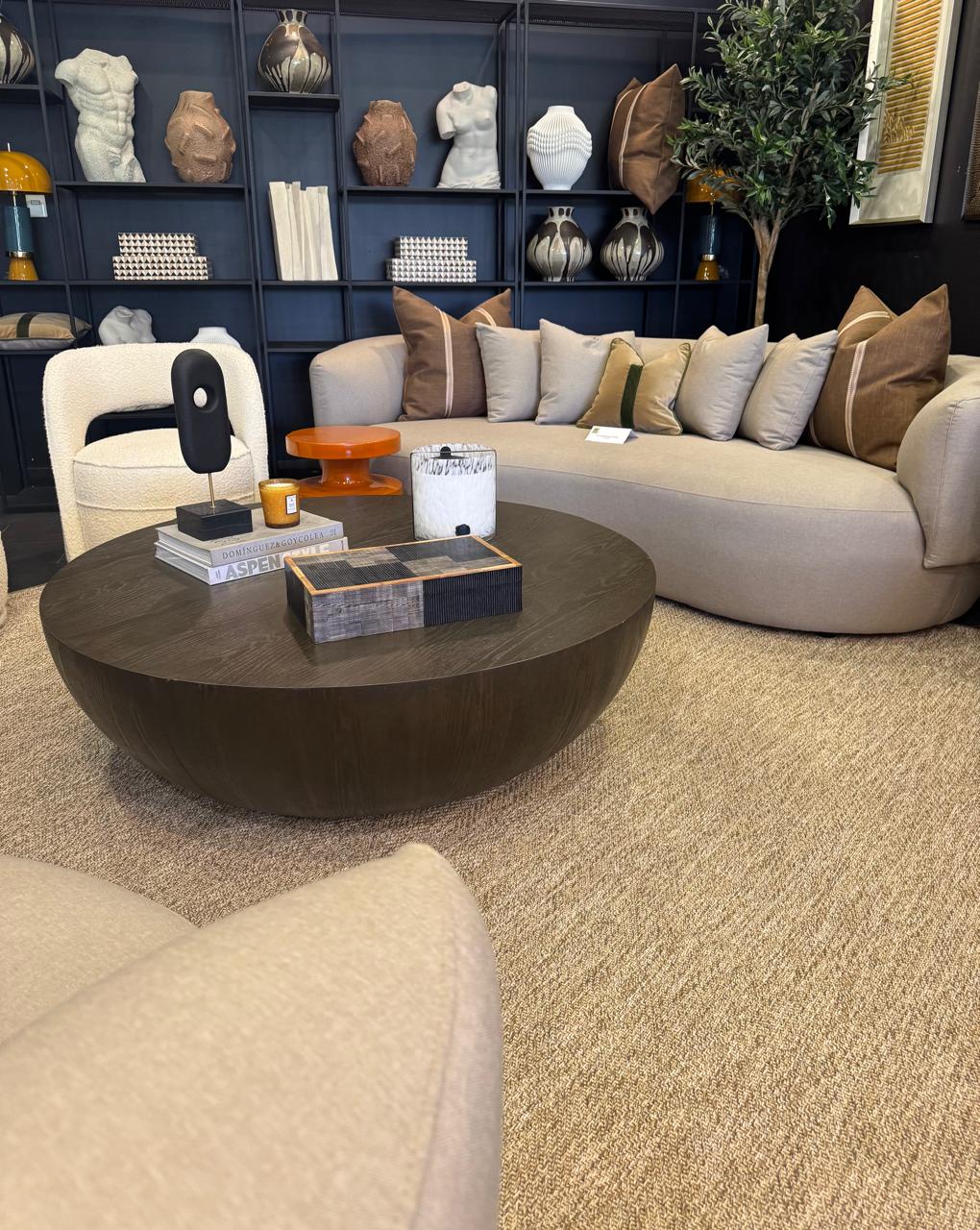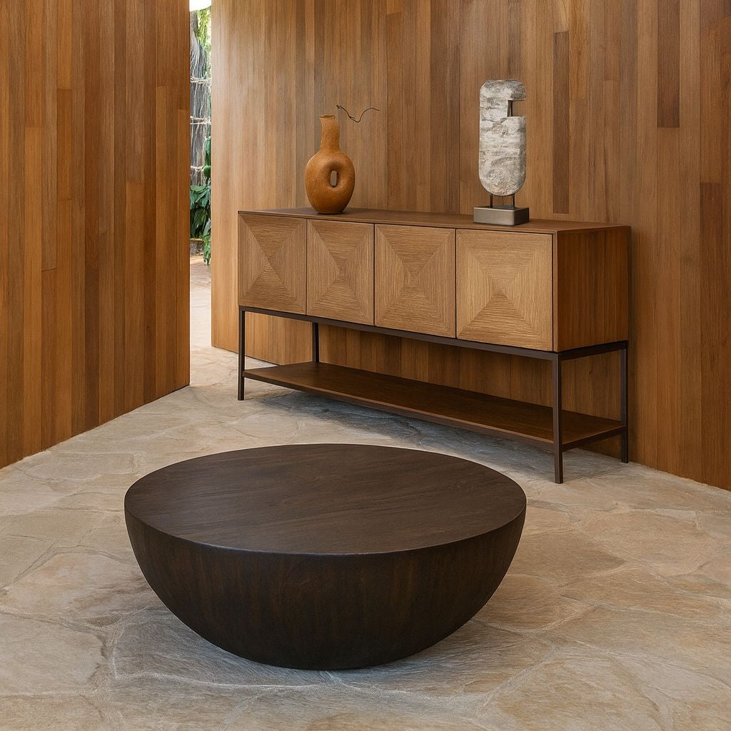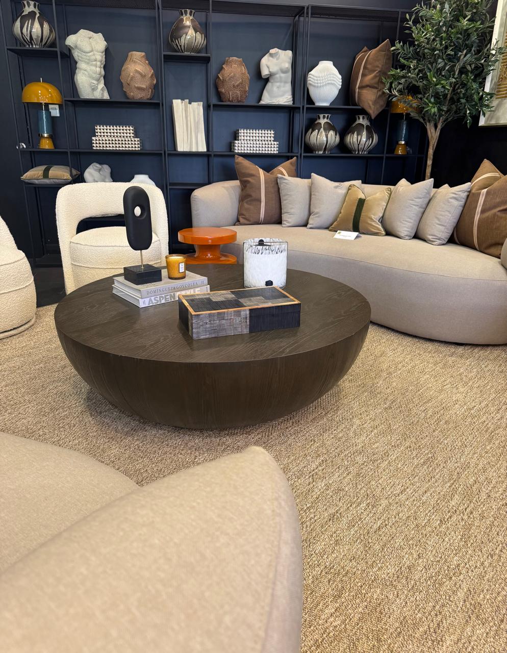 La Mesa de Centro Macarena está elaborada enchapada en roble con una sutil forma hemisférica. Sus lados curvados armonizan con la veta natural de la madera, suavizando la presencia estructural de la mesa mientras le da un toque de elegancia rústica.