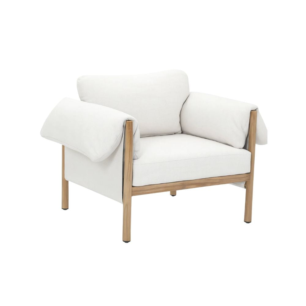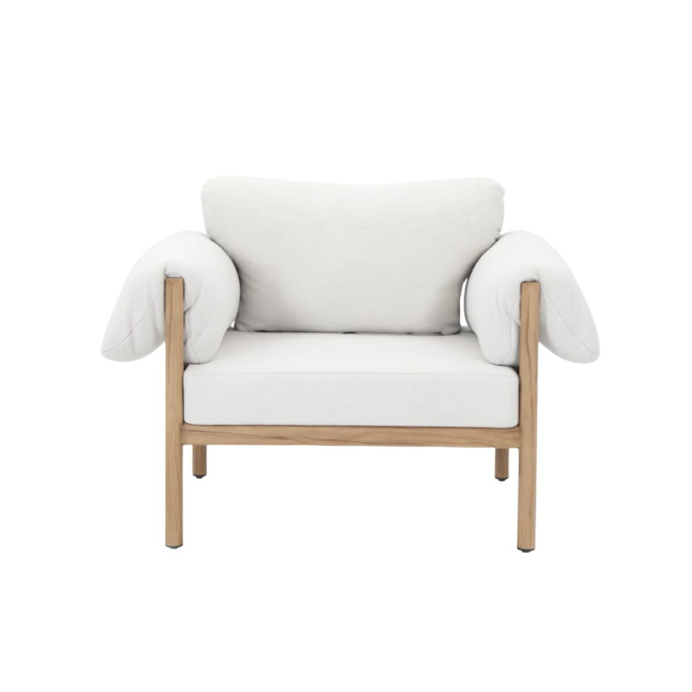 Sitial Mallorca de diseño contemporáneo, fabricado en aluminio electropintado look madera, con respaldo y asiento acolchados en tela. Sus apoyabrazos anchos y su estructura expuesta aportan un estilo relajado y elegante. Ideal para complementar espacios interiores o terrazas TECHADAS.