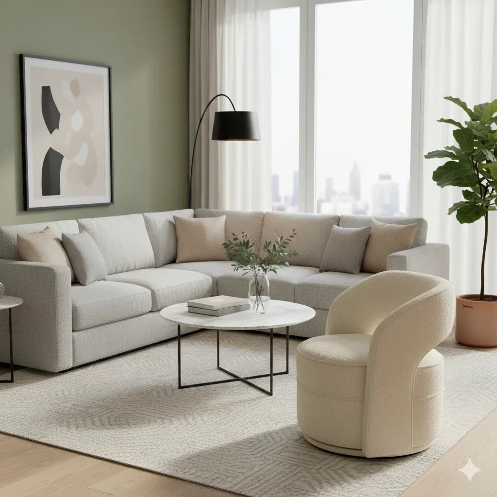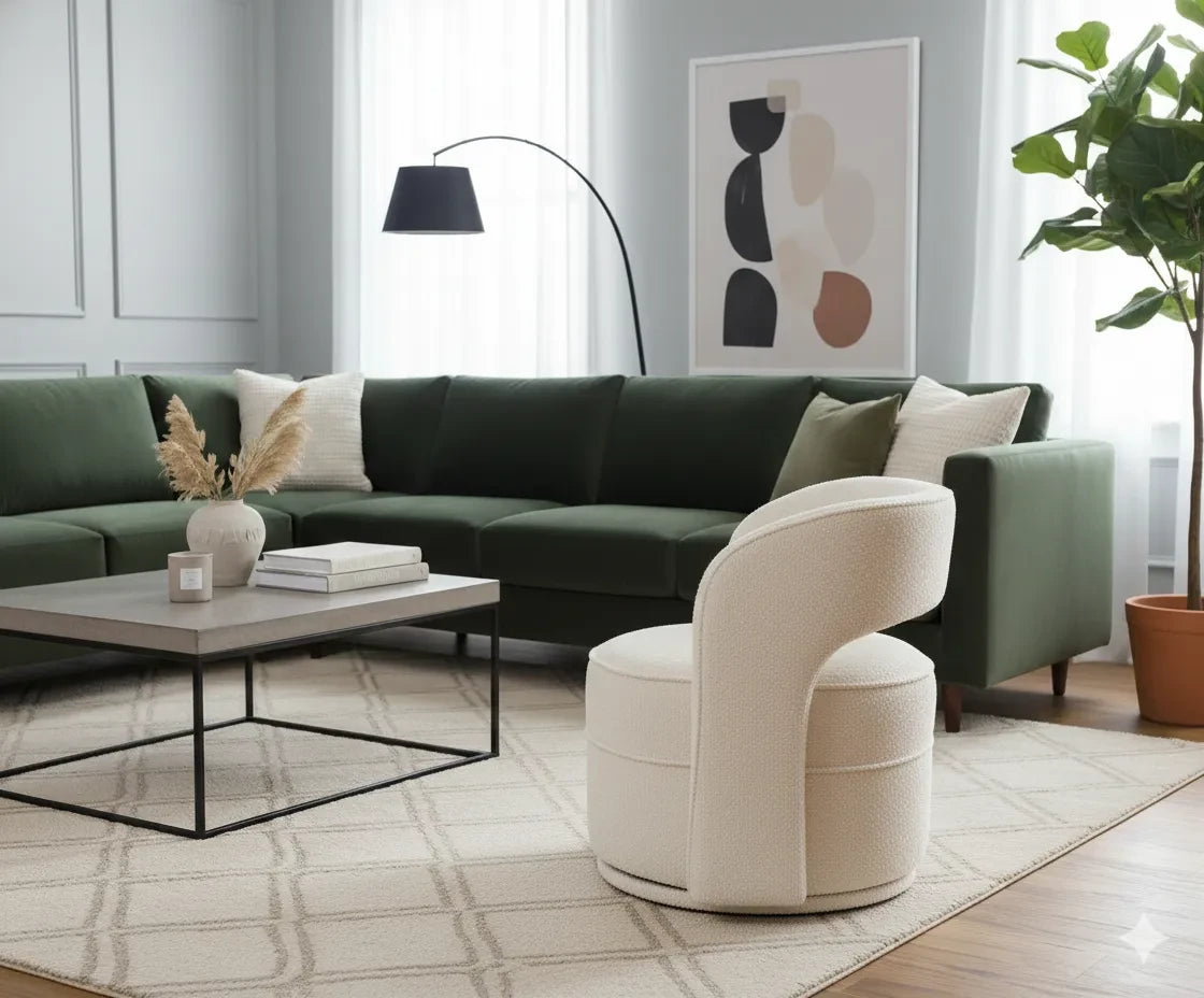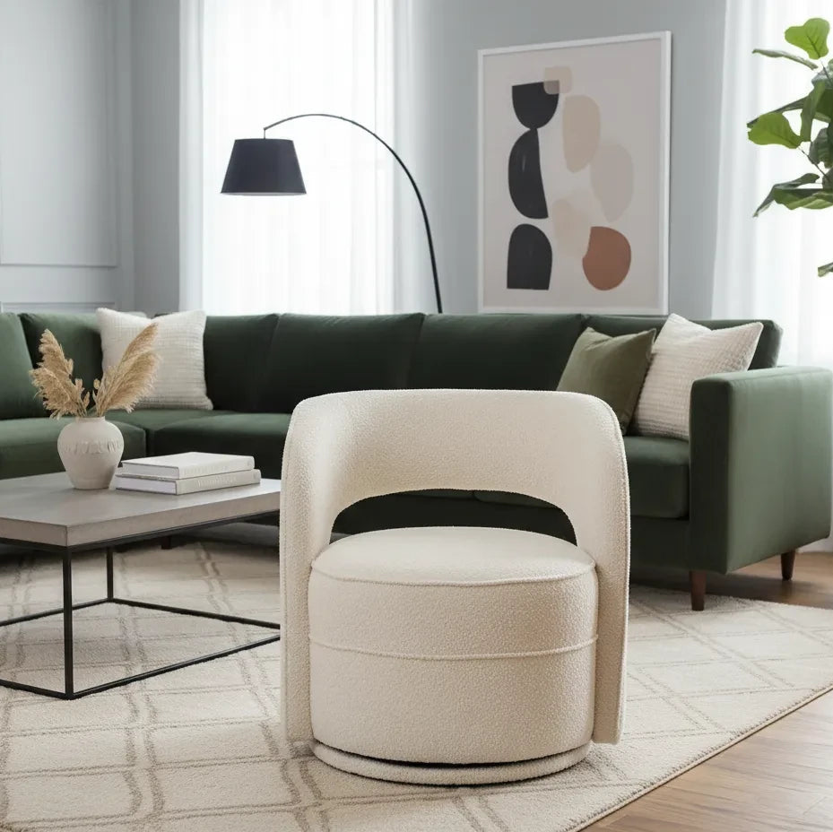El respaldo curvado y el asiento generoso invitan a sentarse envolviéndose en una forma ergonómica que equilibra suavidad y soporte. Tapizado en tela bouclé de tono marfil —queue suave al tacto y visual atemporal— destaca por su resistencia y acabado texturizado. La base metálica, sólida y silenciosa, está diseñada para girar con suavidad, lo que lo convierte en una pieza dinámica perfecta para espacios versátiles como salas, oficinas o rincones de lectura.