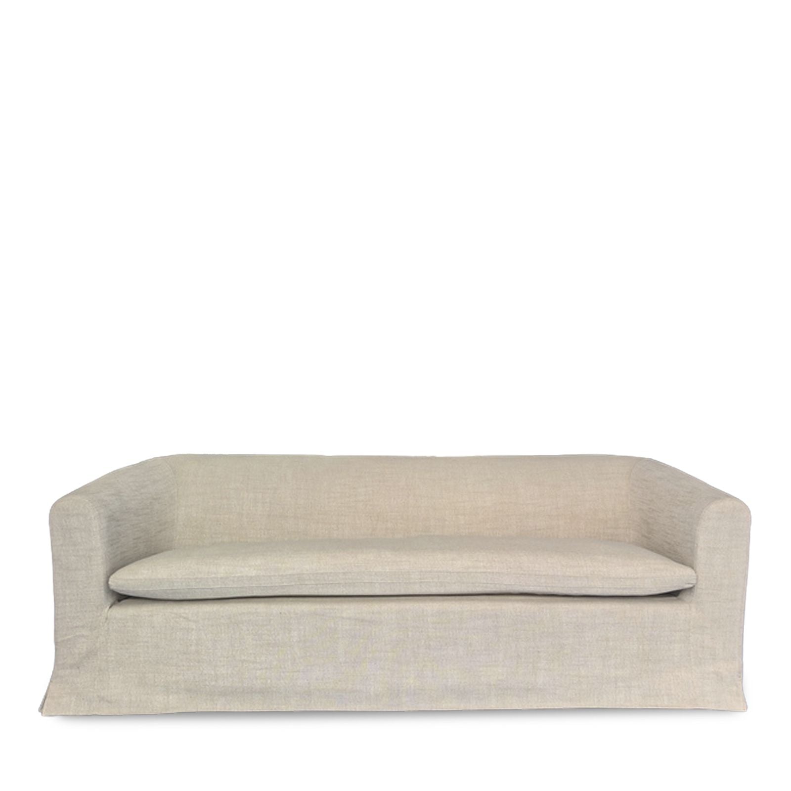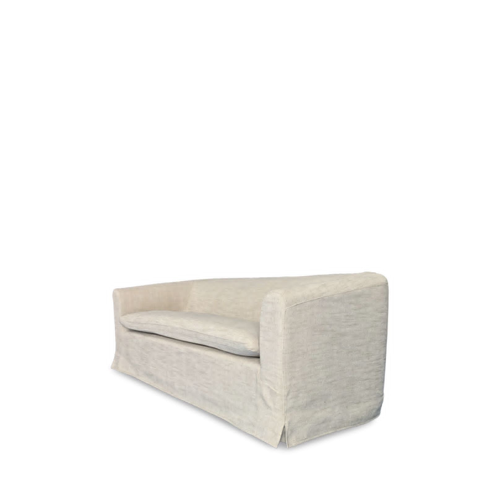 Sofá de líneas suaves y continuas, tapizado en lino beige natural. Aporta una elegancia relajada y atemporal. Es una pieza noble, silenciosa y profundamente contemporánea.
