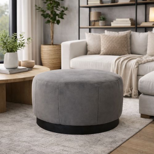 Está tapizado en tela de tono gris medio con acabado tipo gamuza o microfibra, de textura suave y apariencia elegante. Su base circular en color negro genera un contraste moderno y le da mayor presencia, además de estabilidad estructural.