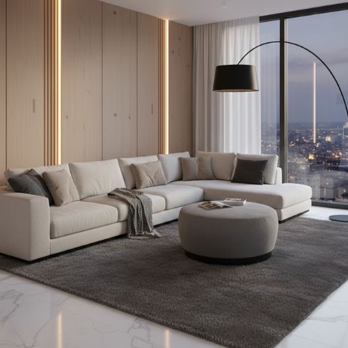 Pouf u ottoman de terciopelo y diseño contemporáneo con silueta redondeada y proporciones amplias que aportan suavidad visual al espacio.